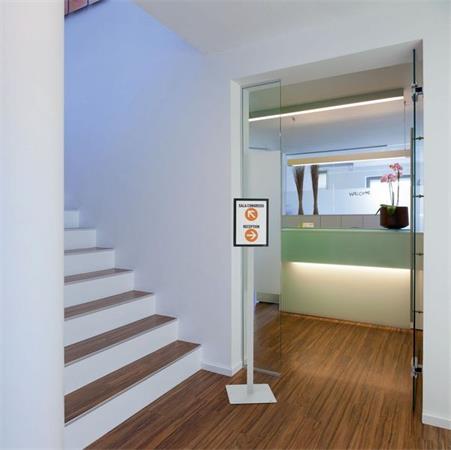 Az INFO STAND BASIC padlóállvány mindkét oldalról olvasható, így mind információk bemutatására, mind tájékozódási és útmutató rendszerként is használható.
