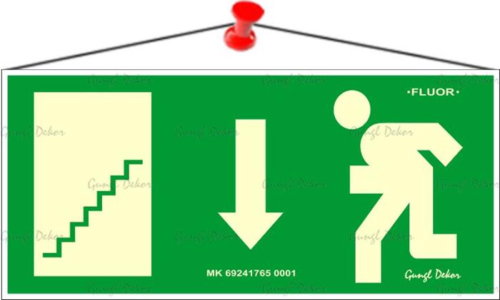 Információs tábla, 25x11,5 cm, fluoreszkáló, utánvilágítós, "Menekülési irány le, lépcső balra"